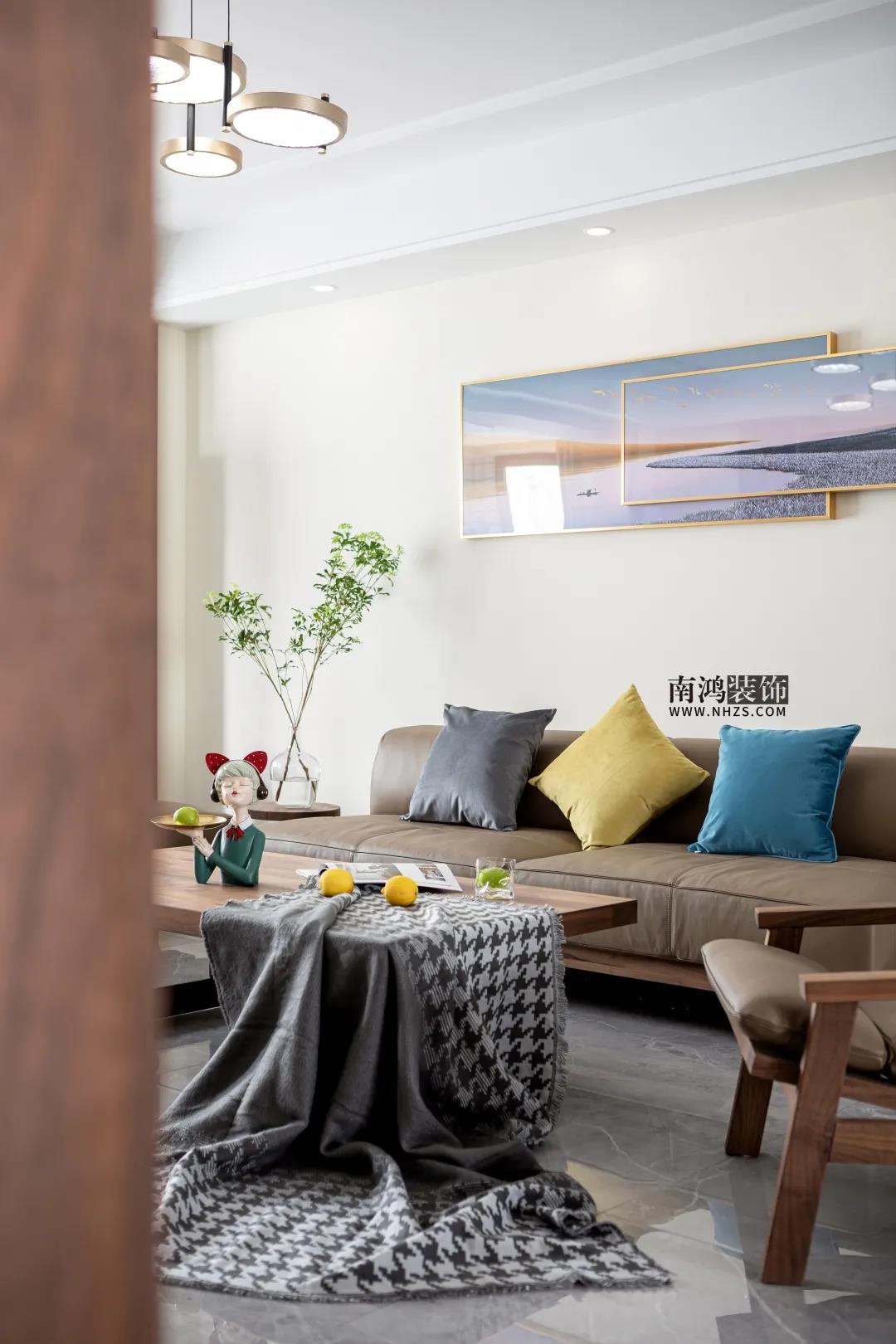 客廳與陽臺打通,讓陽光能恣意地傾灑進(jìn)來。室內(nèi),胡桃木色的家具較為沉靜,卻也容易流露出呆板,我們便添加入清新的軟裝、可愛的擺件進(jìn)行中和,豐富色彩,活躍氛圍。