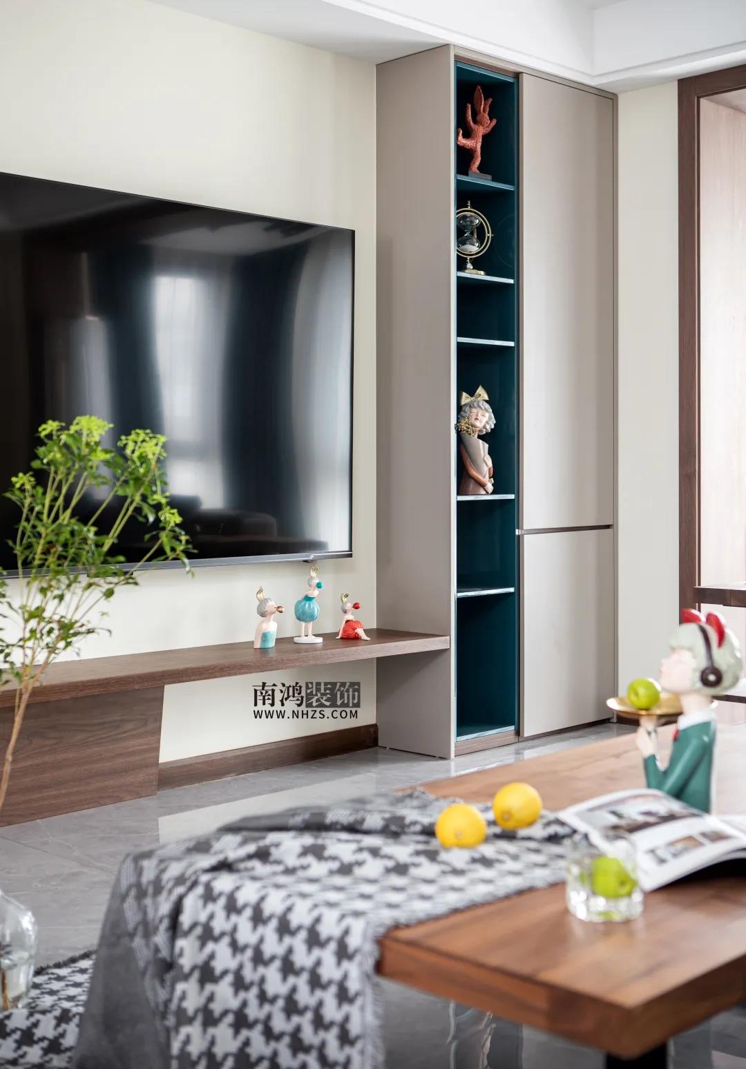 墻面米白色的乳膠漆呈現(xiàn)明快而溫馨的空間感,電視背景墻一側(cè)是通往書房的隱形門,另一側(cè)則打造一排收納柜用以展示和儲物。