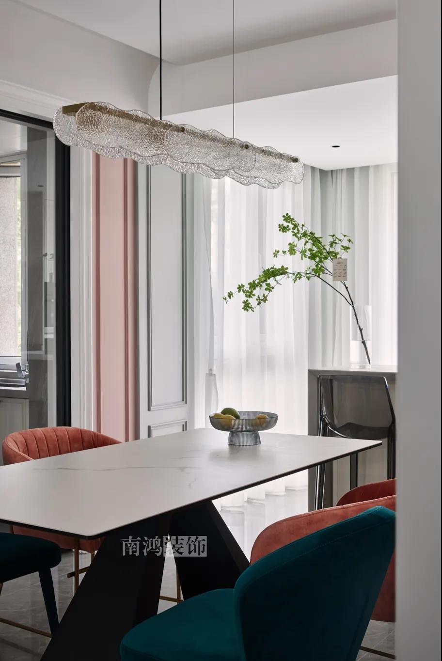 01. 客戶需求 本案的屋主非常喜歡小美式風格的清新自在,又向往著現代簡約所傳達的生活理念,所以設計師依照他的喜好,將兩種風格元素巧妙糅合,讓整體空間在浪漫優雅的情調中傳遞出主人的獨特品味。 02. 裝飾亮點 REFRESHING 擯棄了粗暴的材質堆砌,將小美式與現代簡約巧妙結合在一起,色調上選用低飽和度的高級灰與柔和的莫蘭迪色,致力于呈現一個唯美純粹、具備高級感的美學空間。 03. 戶型圖 04. 設計落地 客 廳 客廳以高級灰為主基調,低飽和度的特性使得它具備很強的包容性。 電視背景將美式的經典線條護墻與利落的大理石磚組合,沙發背景則做了木護墻隱形門處理,配以簡單干凈又不減細節的吊頂,既實現了兩種不同風格元素的結合,又能讓造型為居家功能服務。 靠近陽臺擺放一把亮麗單椅,電子壁爐內躍動著溫暖的火苗,成為美妙的休憩一角。 節制而有意蘊的設計手法,賦予空間最具詩意的內涵表達。 開放的領域中,客餐之間連貫而又相對獨立,在敞闊的尺度中讓主人感受到家的舒適。 餐 廳 餐廳,是讓人走近便頓覺眼前一亮的空間所在。花朵般嬌嫩的煙粉色,是莫蘭迪色系中超有存在感的一派,又如晚霞,純凈美好,撲面而來便是夢幻與浪漫的氣息。 餐廳處還添加入西廚的功能,讓廚房實現多功能化,同時弱化了原區域的狹長感。 過 道 “人生忽如寄,莫辜負茶、湯和好天氣。”清朗平和的過道景致,自給人一種寧靜的深邃感受。 臥 室 臥室刪繁就簡,通過淺色的床品與干凈的硬包背景,營造簡約純粹的清韻。 兒童房是一個多姿多彩的空間,活潑的星星圖案,多種低飽和色調搭建的背景墻面,整體氣氛輕松愉悅,作為一個成長型空間來說也充滿著可塑性。 衣 帽 間 純白的視象,抽離了所有多余的表達,兩側衣柜默默擔當著收納的使命,井然有序地包容著一切冗雜。
